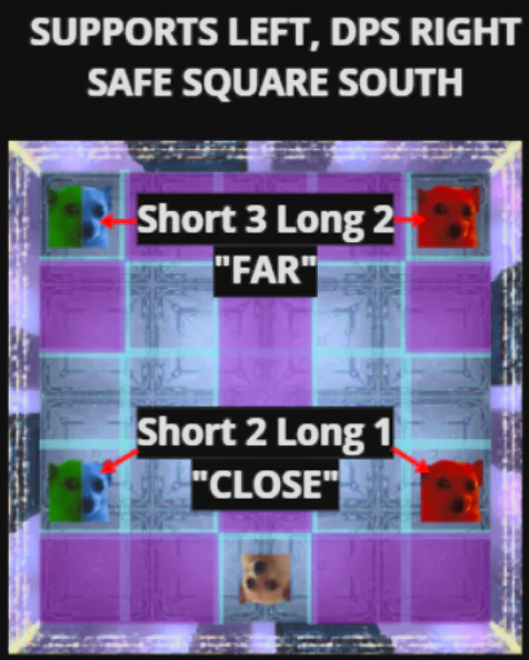To resolve this mechanic, the LONG players need to stack on the safe spot at south. SHORT players need to head to their respective spots based on the number of times they were hit. To make this easier, we have the 3 hits go far to the corners and the 2 hits close, against the south set of AOEs at the wall. Supports will always go to the left and DPS will always go to the right, facing relative north. See the macro/cheatsheet for these exact spots.