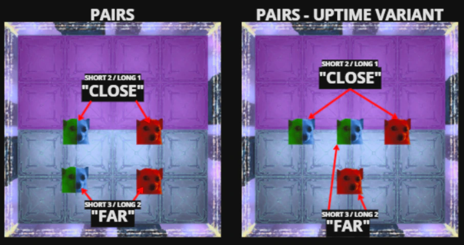 If it is pairs, the pair stacks will target the long players meaning regular pair stacks cannot be used. Instead, static pair stack positions are assigned based on whether players were far or close as this guarantees a short and long player will be stacked.