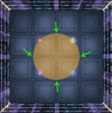 The waymarks and floor markings here are also very useful to help you determine the size of the upcoming point-blank AOE. The PB AOE and donut cleave directly through the middle of the waymarks and the intersection of the cardinal tiles (green arrows).