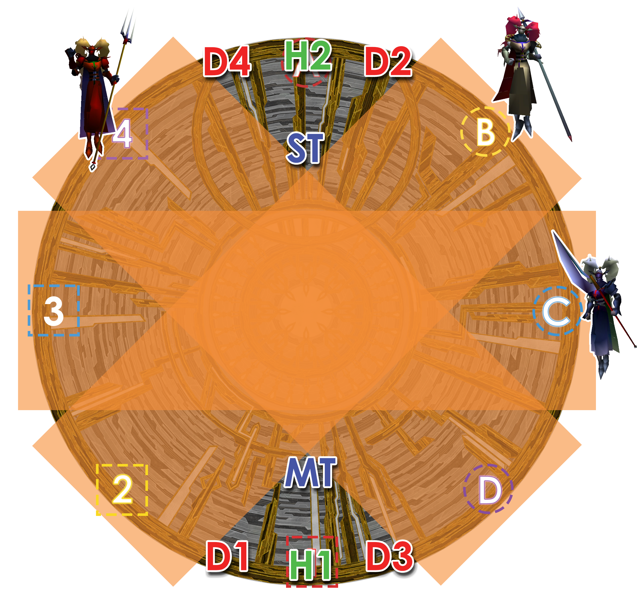 The 1st and 4th Doom will stand outside of the inner circle to bait the circle tethers, and the other Doom players will stand on the relative NW/NE of the middle circle, surrounding Grinnaux. The non-Doom players should roughly spread to SW/SE and N/S, using eyes to adjust to be opposite your Doom player.