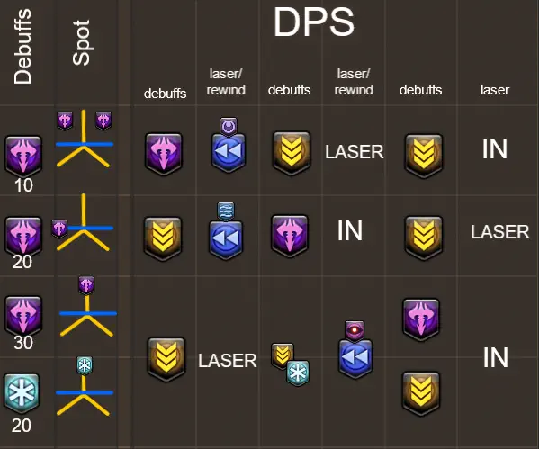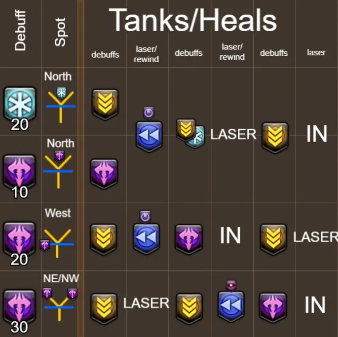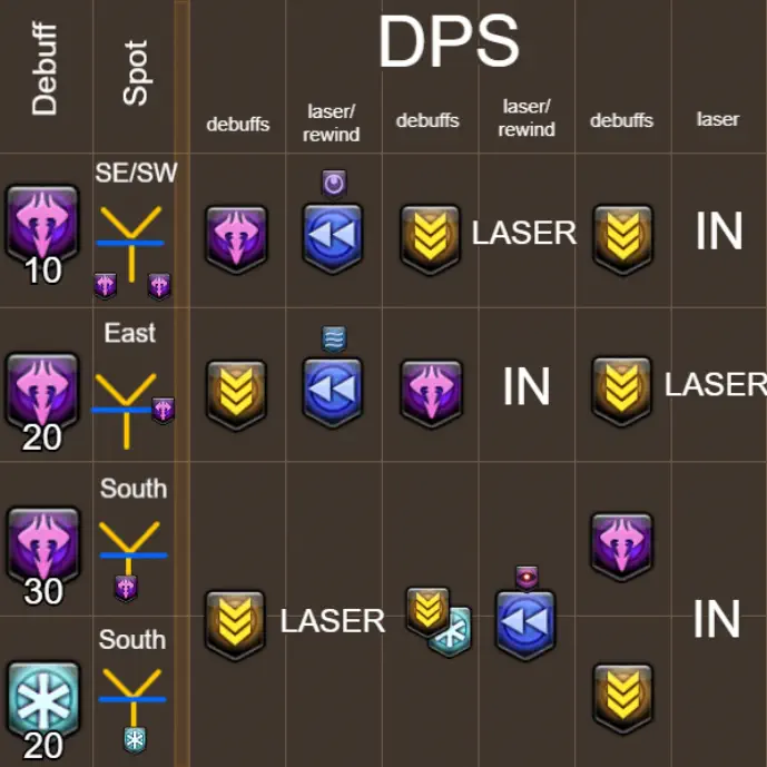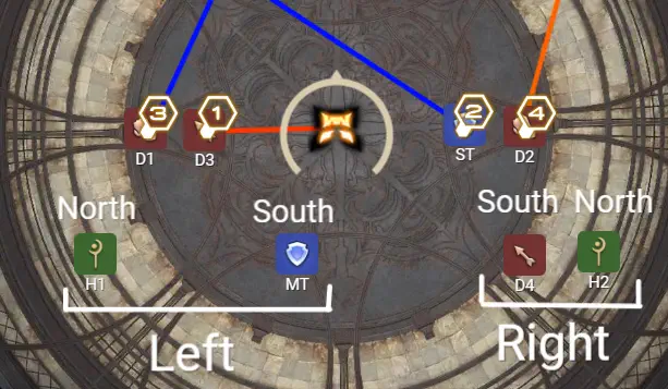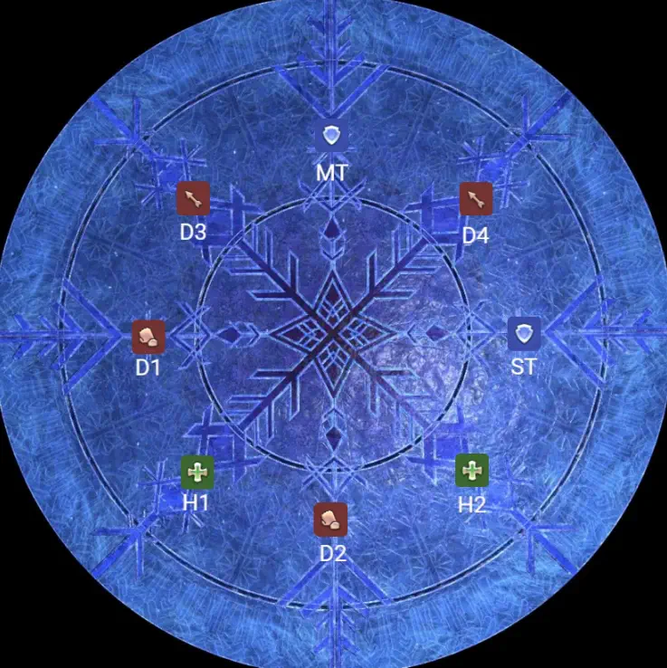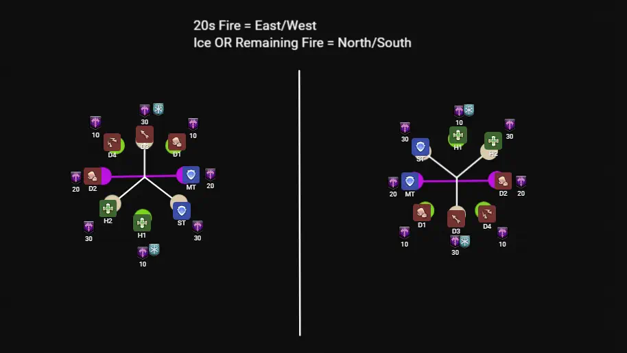As Crystallize Time is cast, 4 players will be assigned a Wyrmclaw (Red) debuff, and 4 players with a Wyrmfang (Blue) debuff. Within the Red debuffs, there will be 2 Dark Aero players and 2 Ice players. Using a lineup/prio system below, these players will sort themselves so that one Dark Aero and one ice are on East and West of the arena.