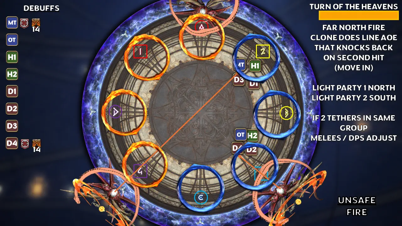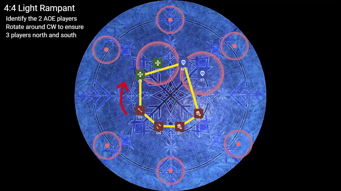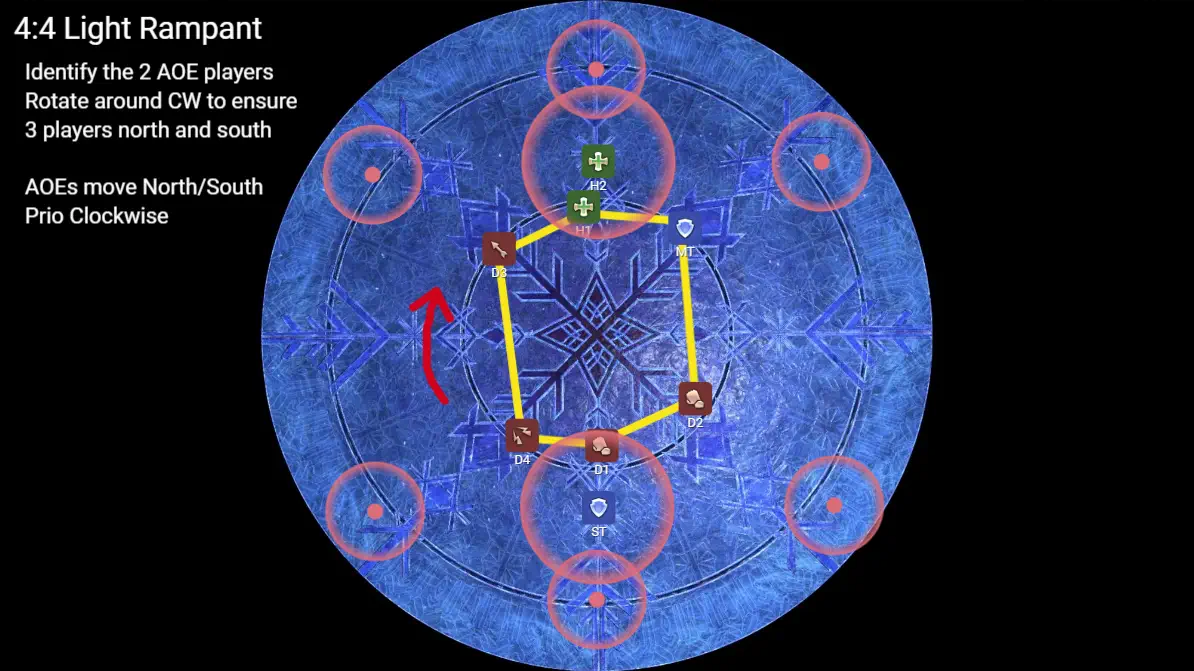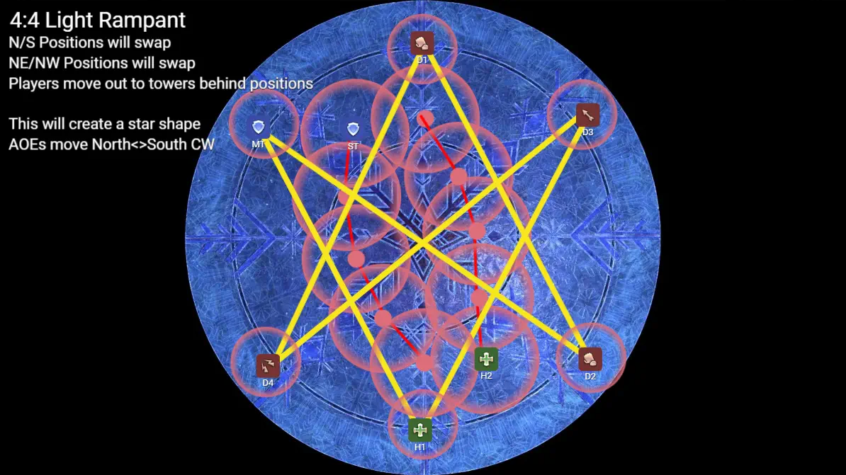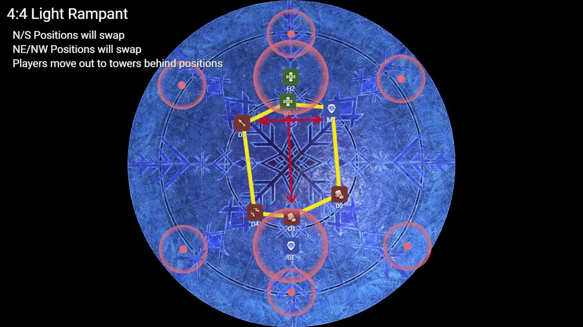Light party 1 will move slightly to the north, and Light party 2 will move slightly to the south. If a swap is required, the priority for the tether that is swapping light party is TMRH. The opposite melee TANK will always flex across to match this movement.