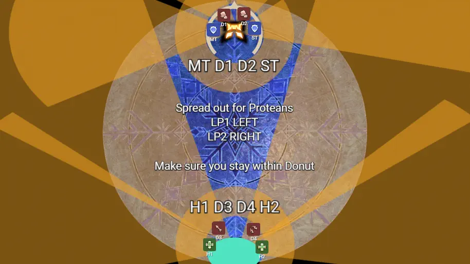 Once the bowtie is formed, the tether players will stand in their towers, and the 4 remaining players will split left/right and shuffle close to Ryne to bait out the Proteans. If both water stacks are on the same North/South side of the room, the untethered AOE player will swap with the untethered player on their side of the room to ensure the water stacks are split north/south.