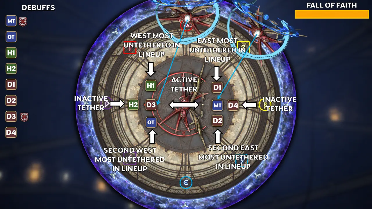 To resolve this, the party will line up south of Fatebreaker. As the tethers are placed, the 1st and 3rd tether will go to the West of Fatebreaker, and 2nd and 4th tether will go to the East of Fatebreaker.