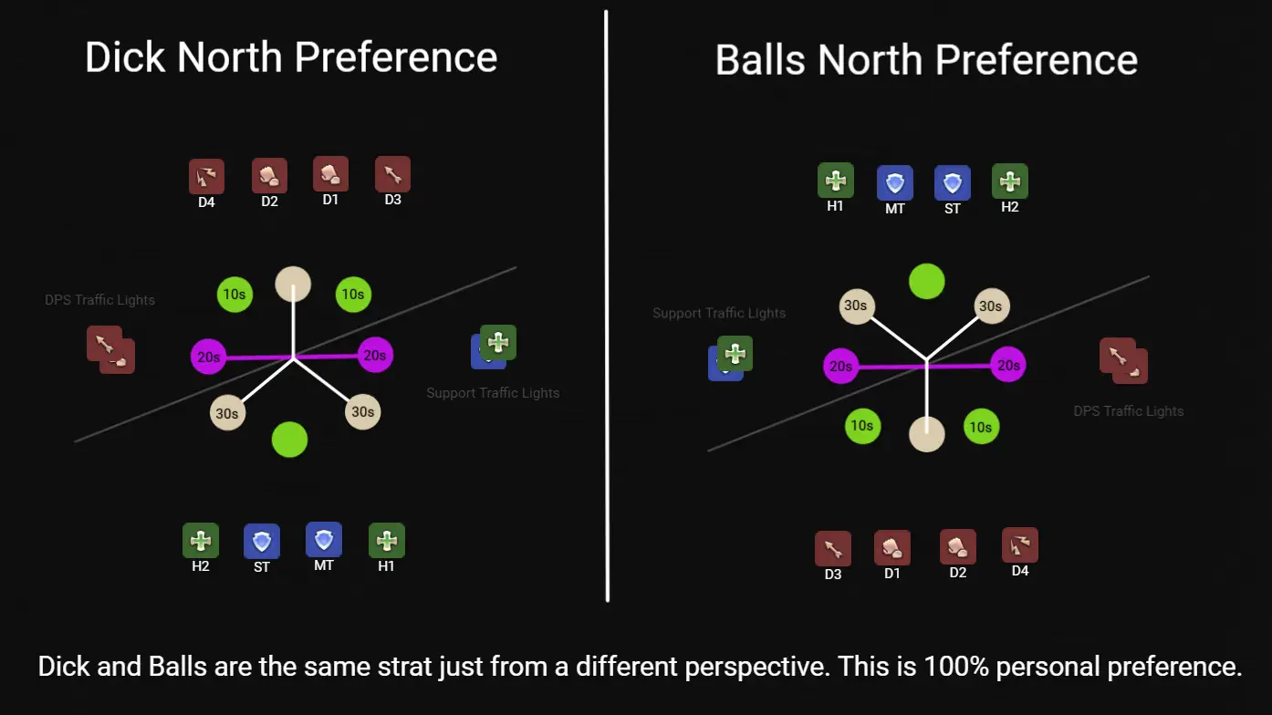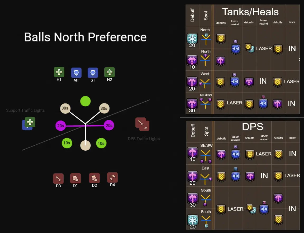 /e ICE - 4 (Purple Corner)In addition to debuffs going out, 6 Traffic Lights will spawn. The Traffic Lights have two possible spawn iterations, where the mechanic solve is simply flipped horizontally.