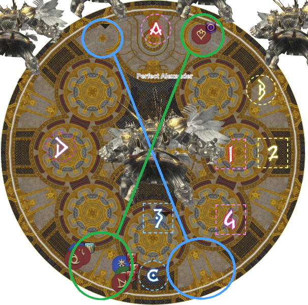 Next, 3 out of 4 of the north Perfect Alexander clones will shoot Sacrament line lasers, leaving 2 safe zones in the arena. The Alexander clone that does not shoot will always be one of the 2 middle ones - looking at the diagram below, if (out of the 2 middle ones), the left does not shoot, the blue areas are safe and if the right one does not shoot, the green areas are safe.