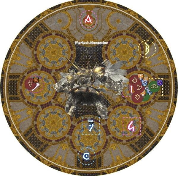Then, after the forced marches, 3 Perfect Alexander clones will J Jump (this is basically the same as Super Jump, just named differently) to the west, south and east cardinals respectively, near the wall. These jumps will need to be baited by 3 players. After, the Perfect Alexander behind the wall at north will cast Optical Sight, which will be either 2 sets of light party stacks, or everyone needs to spread out.