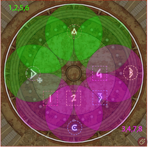 After the tethers, shared sentence and J Jumps resolve, players should position themselves for Optical Sight. Spread out, or if it was stack, all dark players gather mid while light players stack at A. Healers should ensure players are topped as much as possible for this part and if it is spread, healers should take priority towards spreading mid to ensure they are in range to heal everyone up.