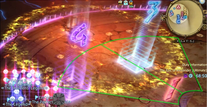 Once the enumerations resolve, Alexander Prime once again becomes targetable and respawns in the middle of the arena, where he casts Mega Holy twice, a hardhitting raidwide which requires mitigation and healing in between. Players should aim to stack towards the 3 Waymark, not only to be grouped for heals but be prepared for the next section.