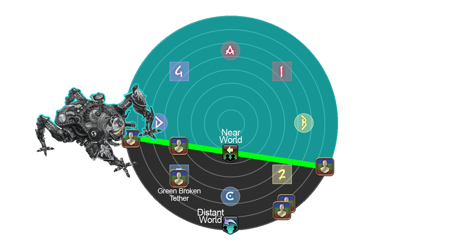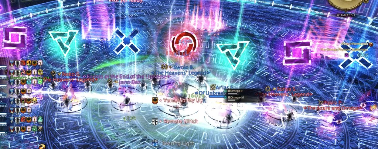 At the beginning of Sigma, each player will be assigned 1 of 4 symbols and be inflicted with Mid Glitch or Remote Glitch, identical to Party Synergy. Two players will also be assigned a Hello, Distant World and Hello, Near World debuff. Two Arms will then spawn eitherside of a random cardinal/intercardinal and attach tethers to the two furthest players away from them. Directly opposite this is where Omega-M will spawn, where the party will move to line up as seen in the MUR cheatsheet.