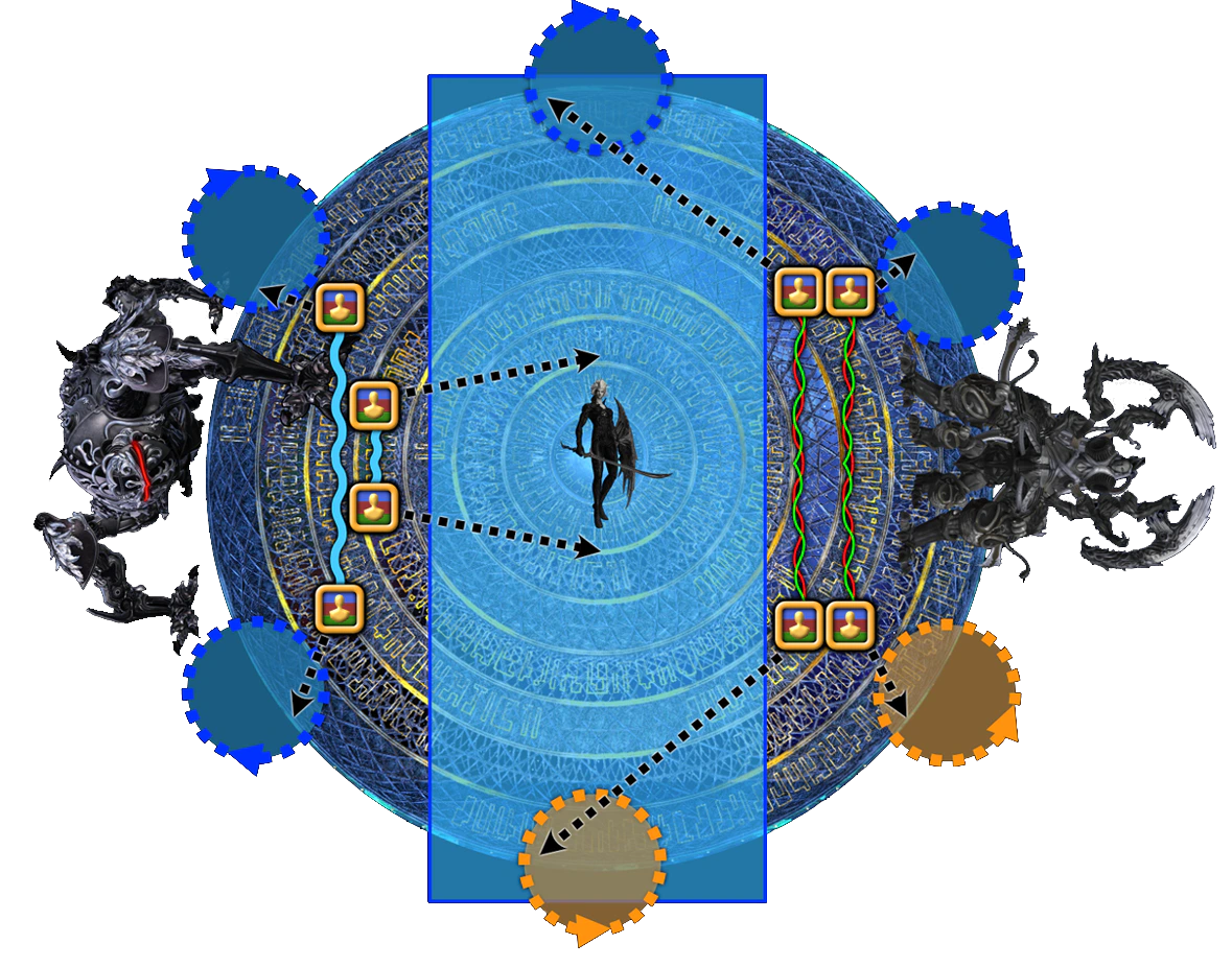 At the same time, Inner Blue Tethers break their tether as they move to the center to bait Beyond Defense from an Omega-M that has spawned. The player that is hit by Beyond Defense must move either East or West so they are not caught by the subsequent Pile Pitch, being careful not to be cleaved by Final Omega's Monitor.