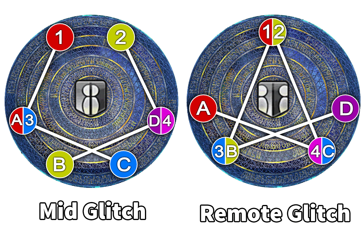 The party is inflicted with either Mid Glitch or Remote Glitch. Each player is also assigned 1 of 4 coloured symbols above their head, with two of each.